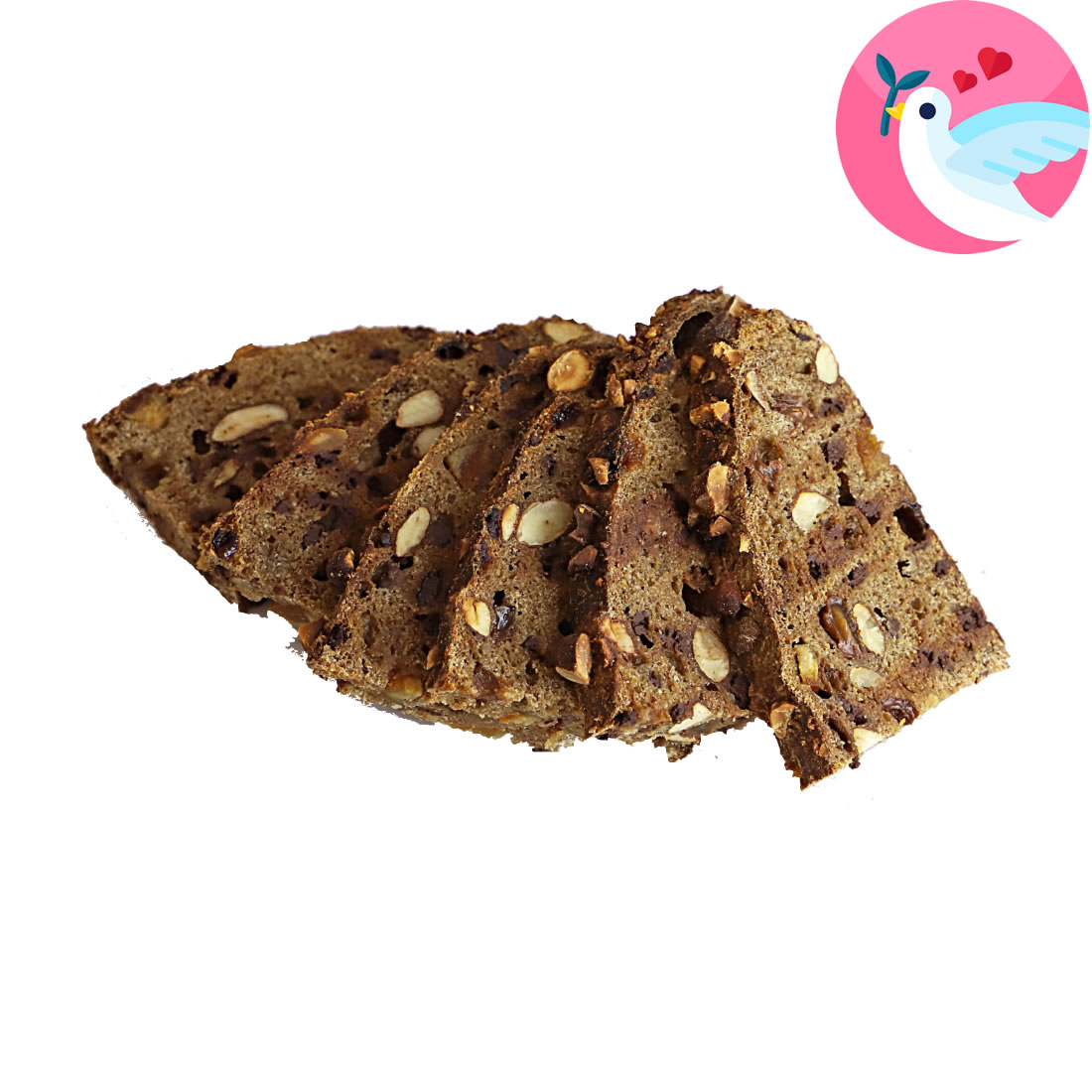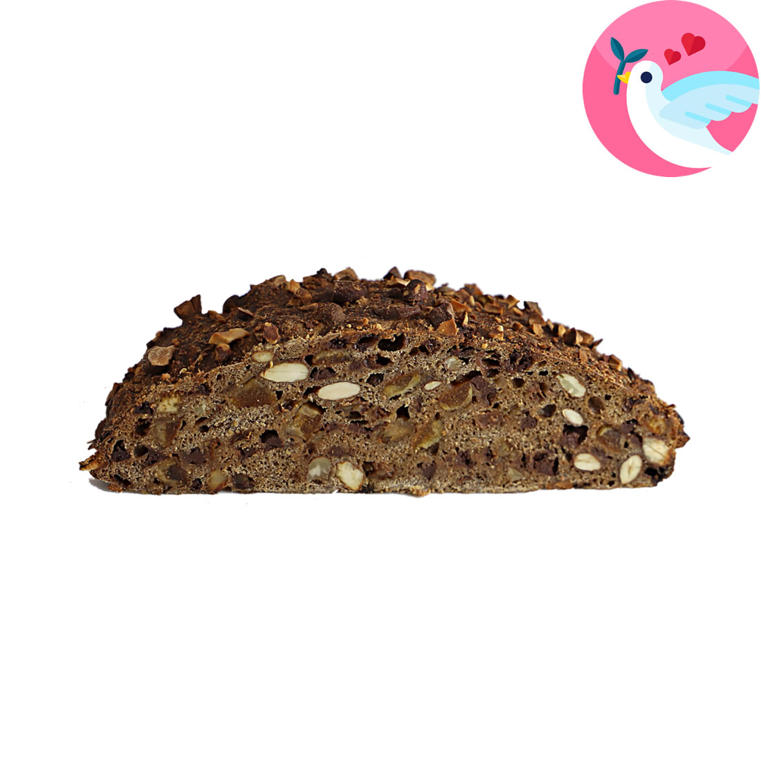 L’impasto è arricchito con mandorle intere ed è addolcito con uvetta sultanina, scorzette di arancia caramellate con zucchero di canna integrale e cioccolato fondente.