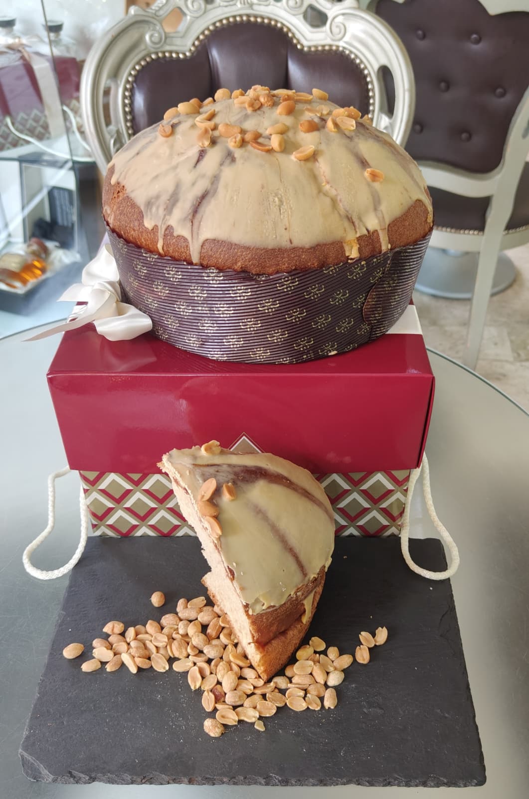 - Glassa: zucchero, burro di cacao, farina di MANDORLE, ARACHIDI, lecitine, vaniglia.